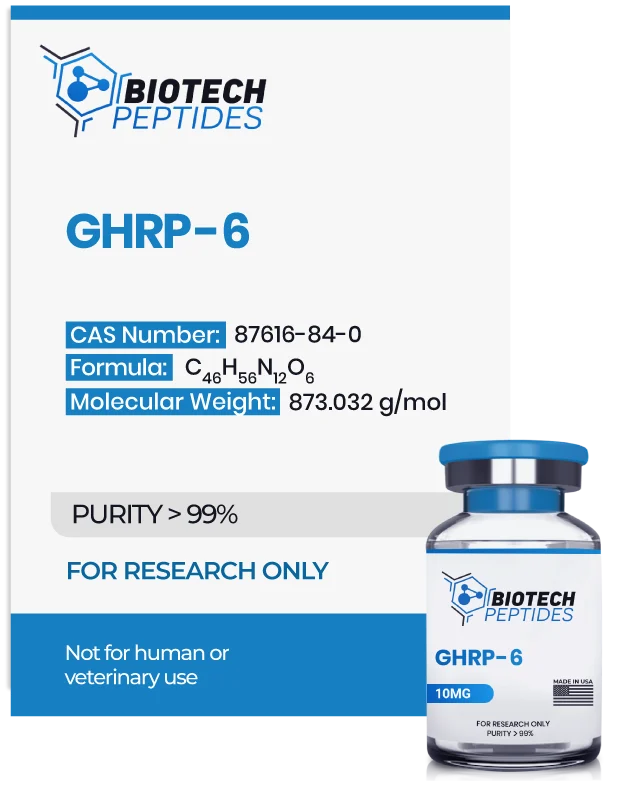 GHRP-6 (Growth hormone-releasing peptide-6) has been studied for its potential as a stimulant to release endogenously produced growth hormone (hGH) from the anterior pituitary gland cells. It appears to achieve that by acting as a ghrelin receptor agonist. Ghrelin, also known as the hunger hormone, is naturally produced by the stomach when empty. This ghrelin receptor is also known as growth hormone secretagogue (GHS) receptor 1a (aka GHS-R1a) and is classified amongst the group of growth hormone secretagogues. It has been suggested to positively influence cardiac muscle cells, scar formation, and memory processing, though it has been involved in research in other areas.